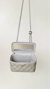 The Chanel Mini Vanity in Silver is a chic and modern piece that instantly elevates any outfit. Its structured box design with a top handle and signature chain adds a sophisticated touch, making it perfect for both everyday outings and evening events. The shimmering silver color catches the light beautifully, ensuring you stand out wherever you go.