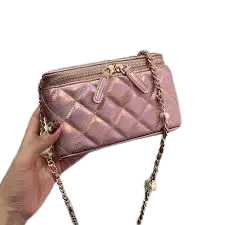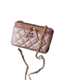 The Chanel Mini Vanity in Pink adds a soft and feminine touch to any ensemble. Its compact, boxy design with a top handle and chain strap combines style and functionality, providing enough space for daily essentials. The delicate pink hue gives a playful yet elegant vibe, perfect for day outings or special occasions.