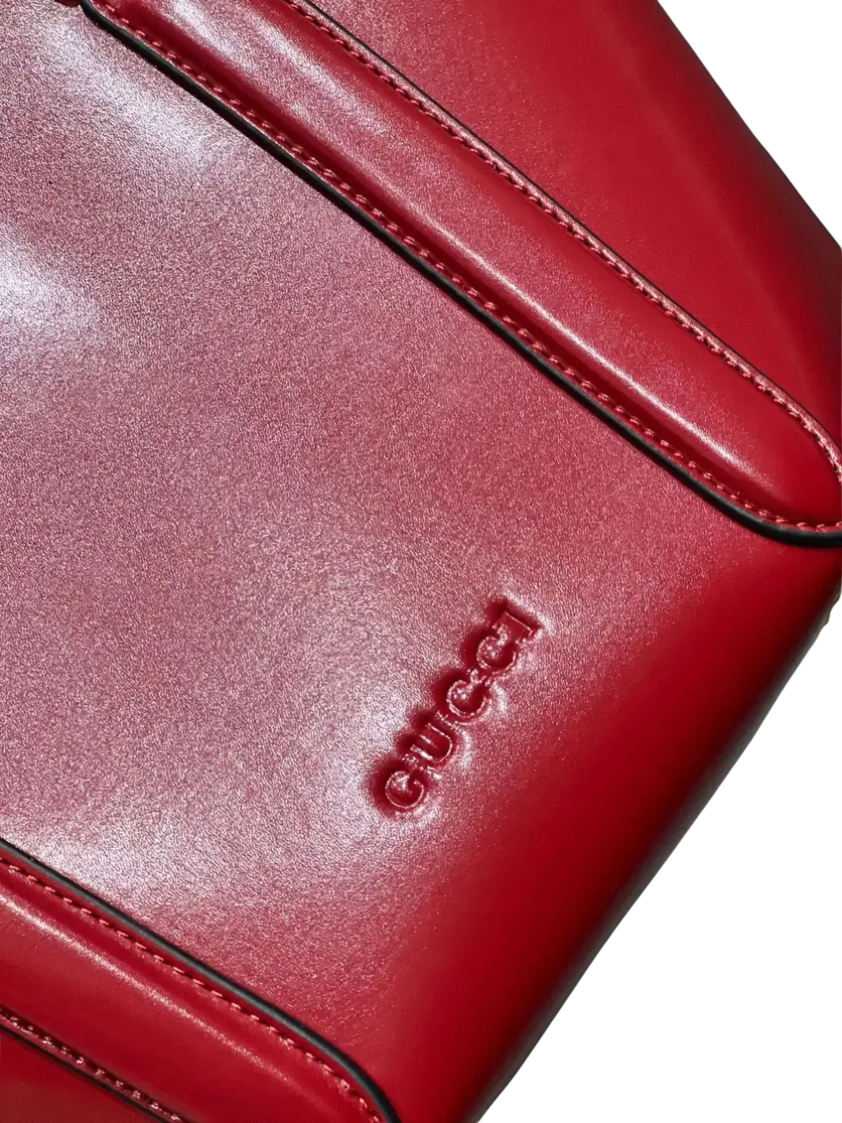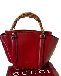 The Gucci Mini Bamboo Top Handle in Red is a vibrant and fashionable bag that combines elegance with modern flair. Its basket-inspired design with a hexagonal base makes it stand out and adds a distinctive touch to your ensemble.