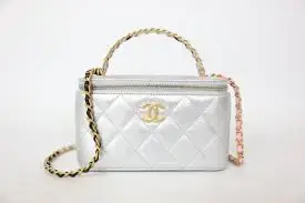 The Chanel Mini Vanity in Silver is a chic and modern piece that instantly elevates any outfit. Its structured box design with a top handle and signature chain adds a sophisticated touch, making it perfect for both everyday outings and evening events. The shimmering silver color catches the light beautifully, ensuring you stand out wherever you go.