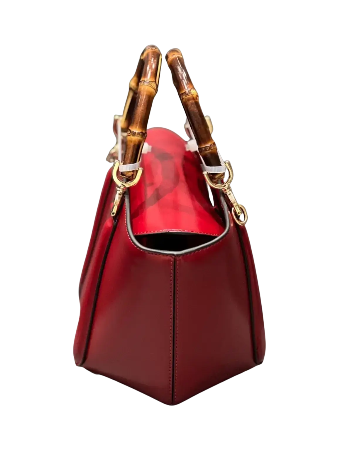 The Gucci Mini Bamboo Top Handle in Red is a vibrant and fashionable bag that combines elegance with modern flair. Its basket-inspired design with a hexagonal base makes it stand out and adds a distinctive touch to your ensemble.