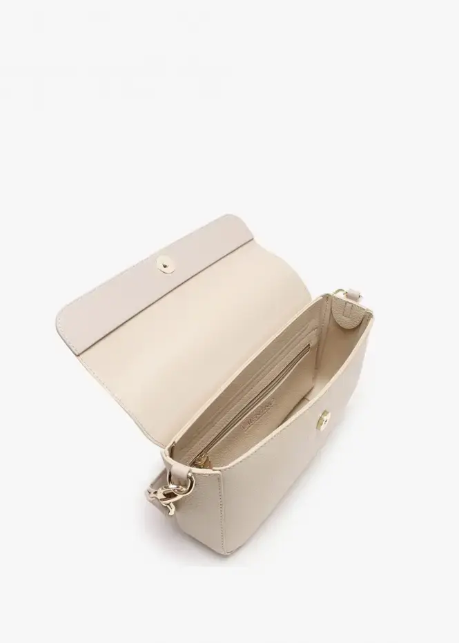 The Valentino Alexia in Beige combines classic style with practical luxury. Made from pebbled synthetic leather, it offers a spacious main compartment and an interior zip pocket for easy organization. Includes a detachable crossbody strap and a short handle for multiple carrying options. Ideal for daytime wear or special occasions.